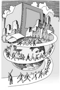 美国加利福尼亚山景路,Google的总部就像一个大学实验室与“兄弟会”会所的混合体。在总部大楼二层的高台上矗立着一台巨大的显示器,屏幕上不断地滚动出现的是来自全球的查询信息。Google的程序员穿着短裤和汗衫,在走廊上来回溜达。他们甚至还经常推着自行车或者牵着一条狗。体积庞大的电脑屏幕被分成上下两个部分。上半部是一幅能显示黑夜与白天的世界地图,地图上遍布各大洲的是一个个闪烁着各种颜色的亮点,每一个亮点都代表着一种不同的语言和几千个要查询的问题;下半部显示用户通过Google查询的问题,一次只出现10个问题,不停地向上滚动,5秒钟后就消失了。所显示的每一个查询问题前面有用户所在的地址,精确到城市。当你第一次研究用户所输入的这些要求时,它们可能显得杂乱无章,不可解释。但几个小时之后,在你的眼球被这些守夜者的亮点锁定时,图案就出现了。这些图案不仅仅是Google用户的分布图,还是现代技术的分布图,甚至是新经济繁荣的格局图。每时每秒,全世界有42%的搜索引擎用户会向山景路这幢大楼所管理的服务器展示自己内心深处的冲动和渴望。