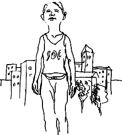 我总会看到马路旁的那座石头人像,那副微笑的空洞的面庞。那本应毫无表情的面庞上有硬生生的毫无思想的笑,我便想它存在的意义。它不会给自己带来快乐,也不会给旁人带来慰藉。于是我就想到他的笑,应该是同样呆滞的毫无思想的笑——他叫大川,至少他的母亲这样叫他——他是个傻子