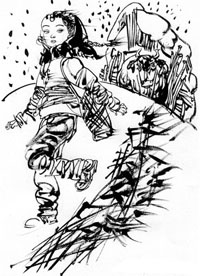 女孩到十五六岁,在当时的山乡已是应该结婚的年龄。早在一年前,家里已为河英准备了婚礼。举行婚礼的前一天,新娘子找不到了,两天后,在我们教室的窗口,躲躲闪闪地伸出了一个漂亮姑娘蓬头散发的脸。她怎么也不肯离开,要女教师收下她干杂活。女教师走过来,一手抚着她的肩头,一手轻轻地捋起她的头发……霎时,两双同样明净的眼睛静静相对。女教师眼波一闪,说声“跟我走”,拉起她的手走向办公室。