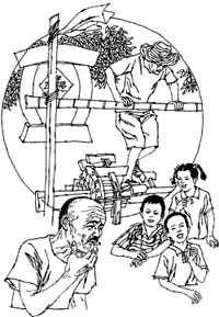 老人又来办法了,水车扒档上挂上一袋子香喷喷的熏青豆。孩子们放学走过时自然嘴馋了。老人说,谁替我踩水车,熏青豆就给谁吃。这一招果然奏效,孩子们顿时欢呼雀跃,一个个小猴子似的快捷地往水车上爬。看着混浊的积水一戽一戽从低洼田里排出来,绿油油的枝叶快活地摇晃在暖风里,老人不禁侧过脸去老顽童似的偷偷地笑。