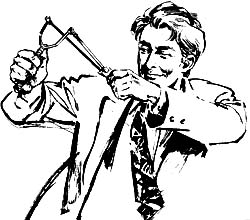 格勒斯基一怒而起,手执弹弓对着我。他那红色的橡皮弹弓,装上了一个沾了唾液的小纸球。几乎就在这一刹那,其余三十九个男孩也站起来,用他们自己的弹弓向我瞄准。这些弹弓是用普通的橡筋做的,只有他们的领袖才用红橡皮筋。