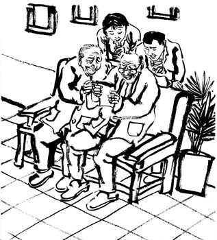 晚上,田兰花问老伴:“老头子,你今天看见那两个小老乡,有什么感觉呀?”石岩反问道:“老太婆,你有什么感觉呢?”田兰花说:“说起来也怪,看到他们,我觉得特别亲切。”石岩笑着说:“老家乡亲嘛,初次见面自然会感觉特别亲。我真羡慕他们,能从山东来南方省城上大学。兰花,你我像他们这么大的时候,受的是啥罪呀!”田兰花说:“你当小长工,我当小丫头,过着牛马不如的日子呗!老头子,星期天叫那两个小老乡到我们家来玩好不好?”石岩笑答:“好好好,我真想再看看他们呢。”通过张永洁传话,星期日两个小老乡来到石岩家,亲热地叫着:“石爷爷、田奶奶好!俺带了两包自家生产的龙口粉丝来孝敬二老。”老夫妻俩乐得眉开眼笑,又拿水果又倒茶,说:“你们到了这里就像回到自己家一样,千万别拘束。”