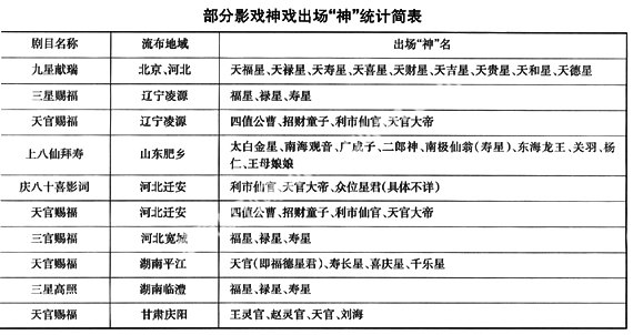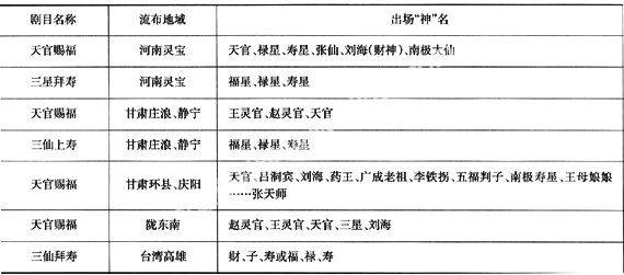 从这二十几个剧本来看,艺人所恭请的“神灵”,除山东肥乡县《上八仙拜寿》中出现有佛教的南海观音和部分艺人想象的“神明”外,余者都属于道教神系(见下表)。艺人将他们搬请出来为广大民众赐福解厄:或赐福添寿赠宝,如福禄寿三星、天官、招财童子、利市仙官、刘海等;或驱邪逐鬼避瘟疫,如赵灵官、王灵官、白猿、钟馗等。