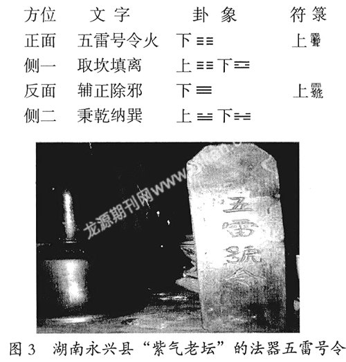 2008年正月,笔者家父不幸病逝。3月上旬,家人为他作了场“两日三宵”的道场。在道场现场,我发现了道士的法器中竟然也有一方以桃木制作的“五雷号令”(图3)。