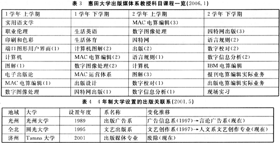 到了2006年1月,11所出版关联的2年制大学只有3所大学(惠田大学、端逸大学、桂园造型艺术大学)仍然保留着出版关联专业。而其他的大学,有的尽管还保留着出版关联专业,但专业名称却改为类似的新闻编辑专业,有的干脆就取消了这些相关专业。如: