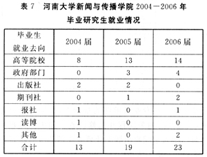 由于各高校管理不一致,就业情况也就不好统计。下面是河南大学新闻与传播学院2004—2006年编辑出版专业研究生的就业情况(见表7)。