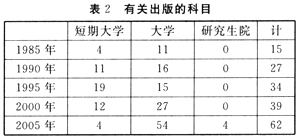 如表2所示,有关出版的科目数从1985年的16个增加到2005年的62个,将近4倍。这些科目大多数是“出版论”、“出版文化论”等名称。因此出版的概论性讲义是绝大多数的,这就成了作为教养教育的出版论。