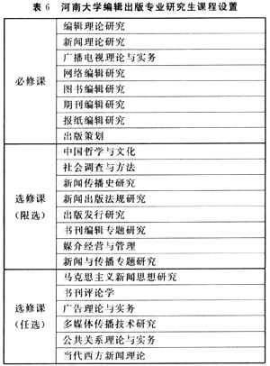 课程设置方面,各院校围绕所开设的编辑出版专业研究方向自行安排上课内容,一般情况下,一个院校的编辑出版专业所依托的一级学科和二级学科的专业基础课,就是该校编辑出版专业研究生的专业基础课。在专业基础课的基础上,根据其研究方向,设置几门相关课程和选修课程。如中国传媒大学与河南大学编辑出版专业研究生课程设置就很有代表性(见表5、表6)。