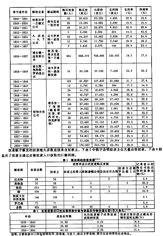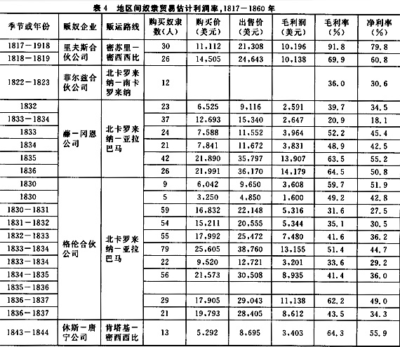 南部的绝大多数重要城镇都有奴隶贩卖商买卖奴隶。在从事贩奴活动的人中,有些人以贩卖奴隶作为自己的长期职业,有些人则是在短时期内从事贩奴活动。沃尔特·约翰逊指出,对于他们中的一些人来说,贩奴活动是他们的家庭商业;对于另一些人来说,贩卖奴隶则是一时的投机活动;还有人把贩卖奴隶作为在工作之外多赚一些钱的途径。尽管这些通过贩卖奴隶赚取利润的奴隶贩子形形色色,但这些人有一个共同之处,“他们都是投机者”。一些大奴隶贩卖企业将总部设在边界州的大城市,在下南部的各地开设分支机构。奴隶贩子将从东部奴隶输出州收购的奴隶贩运到西部新兴的奴隶输入地区,利用奴隶价格的地区差来赚取利润。下表4显示了部分贩卖奴隶企业的利润幅度。很显然,虽然贩奴企业的利润率有高有低,但绝大多数奴隶贩卖行动都有很高的利润,不存在绝对不赢利的情况。
