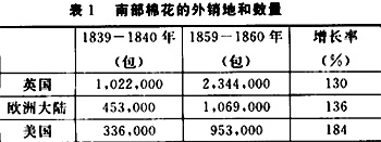 内战之前,南部最重要的商品农作物是棉花。棉花生产集中在下南部的黑土地带(The BlackBelt)以及上南部阿肯色州的部分地区。这个内战前南部的棉花王国,总面积大约400,000平方英里(1,040,000平方公里)。从南卡罗来纳州向西绵延到得克萨斯州,长达1000英里(1600公里),南北宽度在卡罗来纳州和得克萨斯州大约是200英里(320公里),在密西西比河谷地(the Mississippi Valley)地区为600到700英里(960至1120公里)。在如此广大的区域内,大大小小的奴隶主使用奴隶劳动生产棉花,通过销售棉花赚取利润。正是基于他们的棉花生产和销售,内战前美国南部的棉花产量和出口实现大幅度增长,成为当时世界上最大的棉花生产和出口地。下表1即显示了19世纪40—50年代南部棉花的出口增长情况。此一时期,英国、欧洲大陆国家和美国北部的棉纺织业正在迅猛发展,为南部的棉花销售提供了巨大的市场空间。由于内战前总体上棉花的市场需求旺盛,所以南部的棉花销售价格尽管有所起伏波动,但变化不大,且在大部分时间内呈上升趋势。“因此,在棉花地带和在南部的其他地区一样,内战所带来的是一个特别繁荣时期的结束。”奴隶主群体的棉花产销旺盛,且又价格不菲,他们从事的蓄奴植棉活动当然就具有赢利性。