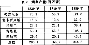 南部的第二种主要商品农作物是烟草。从殖民地时期开始,烟草就成为了南部的主要商品作物。不过,在内战之前,烟草种植的地区发生了变化。殖民地时期的烟草种植开始于弗吉尼亚和马里兰的大西洋沿岸平原地带,18世纪后半期种植范围扩展到了弗吉尼亚西部的皮德蒙特地区,到19世纪中期,东部的烟草种植中心已经从詹姆斯河下游转移到了弗吉尼亚的中南部地区,以及与其毗连的北卡罗来纳中北部地区。马里兰的切萨皮克湾西岸地区仍然种植烟草,但东岸地区则完全放弃了烟草种植,肯塔基和田纳西则成为新的烟草种植地区。烟草的价格在19世纪前半期虽然多次反复起伏,但50年代普遍的经济繁荣使得烟草又处于高价位。下表2显示了内战前烟草生产增长的情况。烟草产量的变化表明,南部烟草产量在1849年比1839年有大幅度下降,但1859年南部烟草产量有更大幅度的上升。这种情况至少说明,奴隶主从事烟草种植同样可以赢利。如果无利可赚,他们就不会继续种植这种作物,那样就不会出现烟草产量在50年代剧增了。