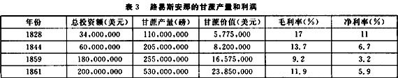甘蔗生长需要有很高的气温,故北纬31度以北地区由于气温较低不能种植甘蔗。甘蔗种植主要集中在路易斯安那南部,得克萨斯和佛罗里达也有个别地方种植。在1840至1860年间,甘蔗的价格一直较高。与其他作物不同,南部的甘蔗主要供美国国内消费而不是出口欧洲。甘蔗种植者主要是大种植园主。下表3数字显示,他们的生产同样赢利。