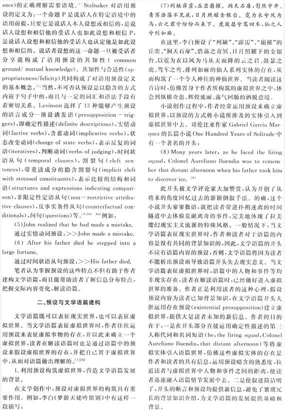 德国著名哲学家高特雷伯·弗雷格(G.Frege)于1892年在其发表的论文《含义和所指》中系统提出:预设(Presupposition)概念是指发话人说出一句话时预先假设成立的命题,其特点是在句子被否定后仍然保留。自1970年起,预设这一借自分析哲学的概念引起了语言学界的关注,成为语言学界激烈争论的话题。预设一直是语义学和语用学的研究重点,前者从命题的真值条件出发研究预设,属于作者的过程;后者主要研究预设在语言使用中的各种情况,属于读者的过程,只有被读者认知的预设才能发挥其基本功能。目前,对于预设在文学语篇建构中所起编码作用,苗兴伟进行了较为系统的论述。但是,从作者编码预设和读者接受两个过程探讨预设在文学语篇建构中能动和反动作用的研究,国内尚属鲜见。本文在研究预设编码在文学语篇建构中作用的同时,着重就读者在文学语篇接受过程中对于预设的解码予以论述。
