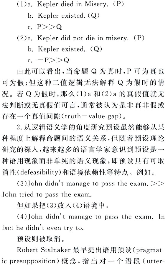 1 语义预设建立在真值条件语义理论(truth-conditional semantics)基础之上,将预设看作是两个语义命题之间的一种衍推(entailment)关系,定义为P预设Q=P衍推Q;-P衍推Q。亦即,命题P预设命题Q,当且仅当:在任何情况下,如果命题P为真,则命题Q为真;在任何情况下,如果命题P为假,命题Q仍为真。例如: