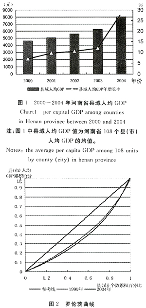 2004年,河南省]08个县(市)人均GDP均值已达8029元,最小值为3146元,最大值为24196元,标准差4425元,极差21050元。其中,郑州市下辖的巩义市人均GDP最高,达到了24196元。然而,河南省县域经济发展整体状况仍然比较落后。2003年我国人均GDP首次突破1000元美金,而至2004年河南省人均GDP在8000元以上的县只有36个,数量仅占全省县域的33.3%。河南省是农业大省,绝大多数县域农业仍然占据很大比重,“郑洛城市工业走廊”沿线地带因具有某种优势工业得以发展,同时带动当地经济增长。而大部分县域局限于农业为主的传统经济增长模式,工业起步缓慢,经济异常落后。