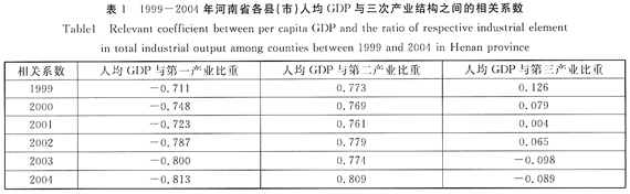 本文采用Pearson简单相关系数这一指标来分析1999—2004年河南省108个县(市)的人均GDP与三个产业结构(各个产业生产总值占国民生产总值的比重)之间的关系。