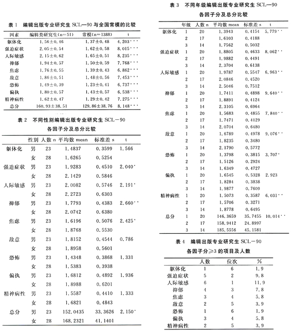 从表1中可以看出,编辑专业研究生SCL-90各症状因子分和总分都极其明显高于常模(P<0.001),具有极显著的差异。说明他们的心理健康程度低于常模,心理健康问题多于一般人群,具有特殊性。