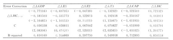 LGDP=1.60587-1.159LE1+2.028LE2-(14.068) (-5.449)