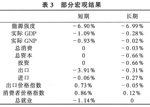 (2)征收能源税在短期内对宏观经济产生了一定负面影响,但从长期来看是可以接受的。在固定国内消费和投资的条件下,短期的主要影响从支出方面是由于国内价格的上涨导致产品国际竞争力的下降,净出口急剧减少;从投入方面是由于实际工资改变导致就业的下降。从长期来看,资本存量的下降引起投资需求的减少是导致GDP下降的主要原因。