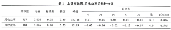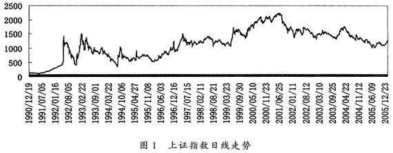 由于沪市(相对于深市)更能体现中国股市的情况,故本文采用的数据是上证综合指数(以下简称“上证指数”)从1990年12月19日至2006年1月31日的所有日收盘价、周收盘价和月收盘价,均取自湘财圆网证券分析系统。图1为上证指数的日线走势图。表1为上证综合指数周收益率与月收益率的统计特征。