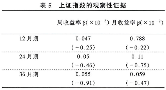 t,是指泡沫开始后的月数,理性泡沫存在时要求,β>0。本文对各股指峰值前的三个部分:12、24和36个月分别进行了检验。从检验结果表5可知,上证指数的周、月收益率在股指达到峰值前的各期间的口系数估计值都为正(虽然并不显著),表明上证指数在达到股指峰值前的收益率在随时间不断递增,比较符合理性泡沫存在的推论。