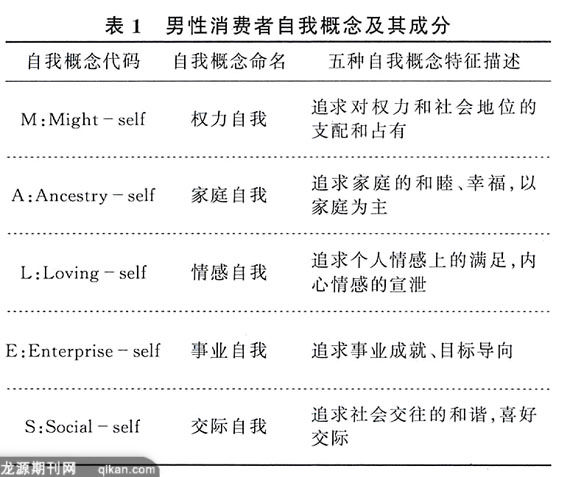 的自我概念是男性消费者自我形象的心理原型,在现实生活中,五种自我概念在不同的男性消费者身上有不同的表现,其中,如果一种自我概念比较突出,则男性消费者形象就会表现为与这一自我概念相一致的形象。为了说明起见,在表1中,对五种自我概念成分进行了描述。