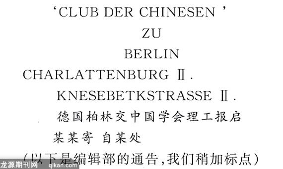 賜教敝同人并所担专科寄至留德学会转交“理工”报收启。