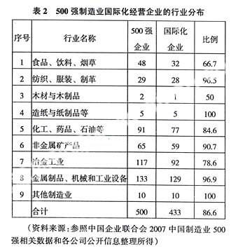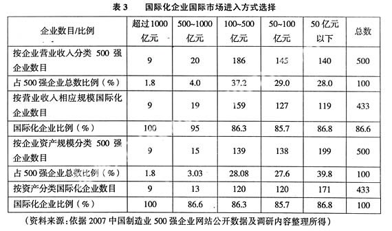 通过以上分析,我们可以发现,一定程度上代表中国制造企业整体实力的500强企业,其国际化发展速度近年来明显加快,并主要集中在我国东部沿海发达地区。虽然与发达国家跨国公司相比,我们在资本、技术、管理、国际化经验等各方面都不具优势,但劳动力密集型行业的企业融入和渗透国际市场的优势明显,而且,面对全球经济的快速发展和我国经济的可持续增长形势,我国企业已从战略上部署了国际、国内资源,在一些资源型产业有了一定的竞争优势,其国际直接投资速度加快。此外,我国国际化经营企业的规模特征差距显著,但在国际化经营战略选择上,尽管超大型企业国际化比例相对较高,可从整体分析,其规模特征差距并不显著,这一特征与传统的国际化经营理论相悖,因此,值得未来国际化经营理论研究的关注。
