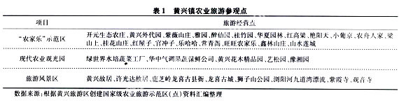 黄兴镇的发展一方面得益于优越的地理位置,另一方面得益于农业旅游的开发。2003年来,黄兴镇依托生态农业优势,农业旅游发展迅速,创建了国家级农业旅游示范区——黄兴旅游区,并于2006年12月接受并通过了国家旅游局的验收。目前,已经形成了一定规模的由“农家乐”——现代农业观光点——旅游风景区的农业旅游体系:其中“农家乐”示范区1个,蓝田“农家乐”示范区被规划为全县三个重点“农家乐”示范区之一,示范区已有28家“农家乐”示范户,并且在长沙市开展的“农家乐”创星评比中,有五星称号的1家,四星称号的1家,三星2家,其他共13家;现代农业观光项目5个;对外经营的旅游区8个。具体经营点如表1所示。