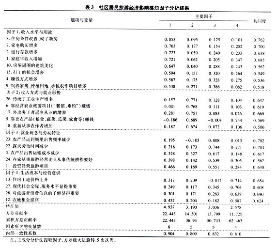 通过对社区居民的旅游经济感知的因子分析,我们发现:农业旅游的社区经济影响主要集中在“收入水平与用途”、“收入渠道与就业形势”、“就业观念与劳动特征”和“生活成本与经营意识”等4个主要因子上,这为进一步集中研究社区居民的旅游影响提供了方向。