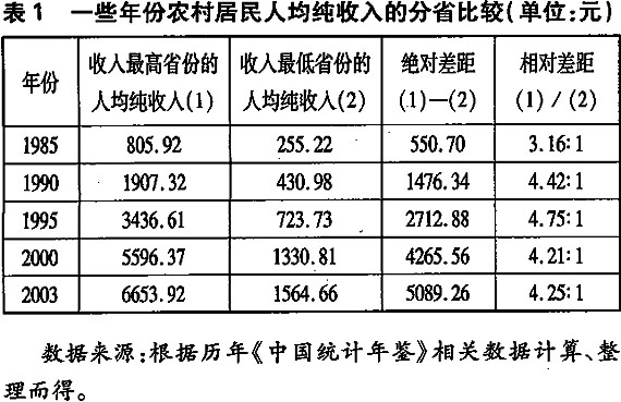 中国经济的发展,总体上采取了一种非均衡发展战略,即允许一部分地区和一部分人通过努力首先富裕起来。这种非均衡发展战略的推行最初是以中央政府的政策倾斜来启动的,例如随着改革开放的进行,中央政府先后在沿海地区划定了五个经济特区,对于经济特区的经济发展给予特殊的优惠政策。这种非均衡战略的推行,总体上推进了中国经济增长的速度,使中国保持了二十多年高速增长,创造了世界经济发展史上的奇迹。最明显的证据是,改革开放以来,中国居民收入不断增长。以农村居民家庭人均纯收入为例,1978年农村居民人均纯收入仅为133.6元,而到了2004年,这一数值上升为2936.4元,年均增长12.6%,扣除物价因素影响,农村居民人均实际收入年均增长7.5%。但是,随着总体经济的增长,增长的不平衡性也在加剧,地区之间的差距不断拉大,中国经济增长中出现了“增长俱乐部”现象,东部、中部、西部三大经济带逐渐形成。三大经济地带之间的增长差距十分明显,并且存在日益加剧的趋势。其最直接的后果就是三大经济地带之间的居民收入差距不断拉大,收入分配不平等在区域层面上表现得越来越明显。仍以农村居民收入为例,1985年,上海市农村居民人均纯收入是全国最高的,为805.92元,农村居民人均纯收入最低的省份是甘肃省,仅为255.22元,二者之间的绝对差距为550.70元,相对差距为3.16:1。但是到了2003年,上海市仍然是农村居民人均纯收入最高的,达到6653.92元,而最低的贵州农村居民人均纯收入仅为1564.66元,二者之间的绝对差距为5089.26元,相对差距达到4.25:1。我们发现,无论是绝对差距,还是相对差距,在收入最高和收入最低省市之间都拉大了,尤其是绝对差距(见表1)。