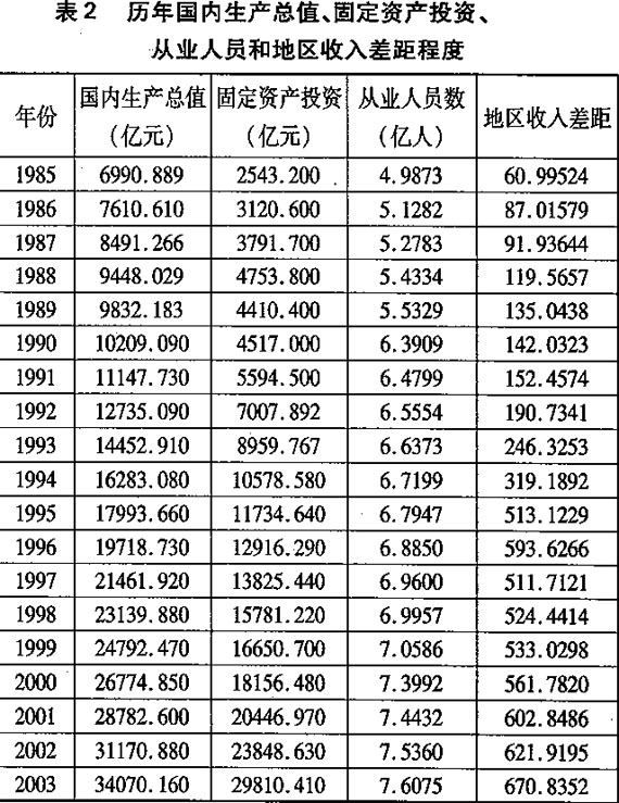 数据来源:GDP数据为实际GDP数据,以1978年为基期,按可比价格计算,根据1978年GDP数据和GDP指数计算而得,其中1978年GDP数据和GDP指数均来自《中国统计年鉴》(2005)。固定资产投资额数据根据历年《中国统计年鉴》数据整理、计算而得,其中1985—1990年的数据为名义固定资产投资额,1991—2003年的数据为实际固定资产投资额,1991年为基期。从业人员数据根据历年《中国统计年鉴》相关数据整理而得。地区收入差距程度数据根据上述公式和《中国统计年鉴》相关数据计算而得。