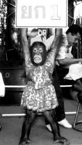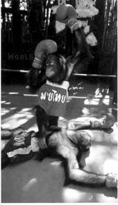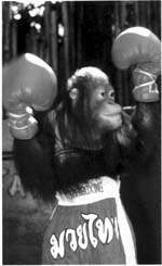 “探险世界”位于泰国首都曼谷,在这里你可以欣赏各种野生动物及奇特的猩猩泰拳赛。1996年12月,这些毛茸茸的拳击手正式上场,这些猩猩界的泰森、何里夫在台上挥舞着它们长长的手臂,击出丛林式的勾拳。当其中一位选手被撂倒时,猴子们会用担架将它抬出去。除了站在场边的训练人员外,这整场秀都是猩猩在表演。