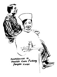 印象最深的是一件小事。有一次,女医助玛格丽丝为病人更换纱布时,少贴了一条胶布。在她离开后病人发现了,随即按铃唤护士。我马上过去帮忙,却出人意料地被护士长阻止了。她立即打电话寻找那位医助。大约20分钟后,已经下班的玛格丽丝又驾车返回医院。她仔细地为病人重新包扎,又为他测血压、量体温、擦背、洗脚,而这些原来都是由护士干的。临了,她还一再询问病人是否有什么不舒服或不满意的。第二天,我同一位护士谈起此事,大大地赞扬了玛格丽丝一通。不料,同事竟不以为然,反而告诉我,如果病人当天晚上给值班院长打电话,那位女医助第二天就会被炒鱿鱼,因为这在爱丽斯医院中是不允许出现的事故。这家医院的管理严谨和职责分明由此可见一斑。