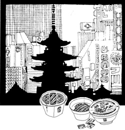 在电视里泛滥的碗装方便面广告是在从根本上破坏日本饮食文化。在那些广告中,注入热水三分钟后,苯乙烯的碗里膨胀起来的仿佛就是日本饮食文化。这不禁让人觉得日本饮食文化太肤浅了。