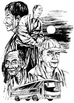 在通往县城再通往省城的公共汽车上,坐着三个年龄都在七十岁以上的老人。