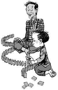 没等我出生,父亲就跟母亲说:“生个儿子,将来就是个科学家。”我还是个小男生的时候,放在高脚童椅里只有一点点,父亲拿来许多铺浴室用的小瓷砖,各种颜色的都有。我俩一块儿玩。父亲把小瓷砖在我的高脚椅上一块块竖起来,摆成多米诺骨牌的样子,我推动一头,它们就全倒下。