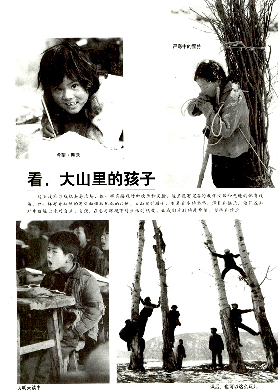 这里没有游戏机和游乐场,但一样有嬉戏时的欢乐和笑脸;这里没有完备的教学仪器和先进的体育设施,但一样有对知识的渴望和课后玩耍的欢畅。大山里的孩子,有着更多的坚忍、淳朴和快乐,他们在山野中锻炼出来的自主、自强,在恶劣环境下对生活的热爱,让我们看到的是希望、坚特和信念!