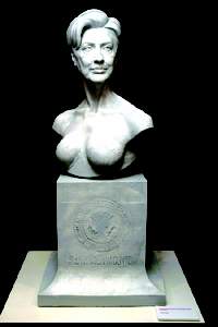 这是一尊无臂半裸塑像,只有胸部一点若隐若现的花纹象征性地雕出胸衣;希拉里的面容被雕成龙钟老态,而一对丰满圆润的乳房却那么年轻挺拔—这简直就是被漫画了的希拉里;面容往衰老的方向夸张,胸脯朝年轻的方向夸张。这还真应验了罗丹的名言:“塑像的时候,千万不要在平面上思考,而要在起伏上思考。”