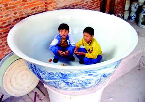 带着这种感觉在景德镇逛街,实在是件悠闲且惬意的事。因为不经意中就能发现陶瓷给这座城市打下的文化烙印。街上的路灯柱、红绿灯竟然都是青花瓷做的!千百年来,景德镇陶瓷业的兴衰起落,留下了许多瓷文化精品及遗存。行走之间,俯首偶得的一些与瓷有关的景物,最能让人眼前一亮:绘画后即将进窑烧制的青花大碗在阳光下晾晒。之后,它们也许就是百姓捧在手里吃饭的碗、舀水的勺。在更多的百姓家里,陶瓷干脆被用作建材,那些精美的柱形陶器将围墙装饰得也别有风味……