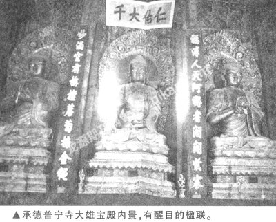 于是,许多年来,介绍承德文史的一些书籍就多这样写了,导游们也如此这般去讲。当然也就等于写给讲给了外地人和承德当地人,并渐渐传将开来。遗憾的是,我们这里有许多人致力研究清代留存下的每一个细节并多有见地, 但在许多时间里, 虽常来普宁寺常看大雄宝殿三世佛常看这副巨联, 却很少对此联注解解生发一问。