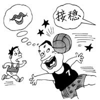 ●某球员连接球都接不稳。练习传接球时,另一球员给他传了一个好球,怕他接不稳,于是喊了一声“接稳”,结果球砸在他头上,只听他说“和谁?”