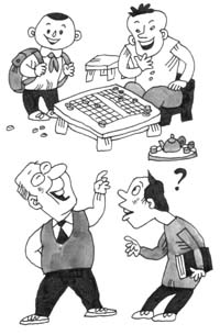 有个人自称棋艺很精,常在别人面前吹牛。一次,有人请他下棋,可是下了两盘都输了。看棋的人都以为他没话可说了,没想到他这样解释说:“第一盘棋叫师傅不赢头盘棋,第二盘棋叫名师出高徒!”