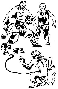 老人似乎生气了,对着站成一排的猴子挨个抡了一鞭子,抽得几只猴子吱哇乱叫。老人大声喊:“立正,稍息!下面给大伙来点绝活!”刚喊完,就见小猴子顽皮地伸错了右脚,老人气哼哼地走过去照着小猴的屁股抬脚就踢,没想到小猴机灵地一闪,老人踢了空,一只破皮鞋脱脚甩出老远,立刻被小猴抢在了手里,任凭老人和少年拿花生、苹果哄,就是不给。眼看猴戏演不下去了,却见小猴指了一下老人手中的鞭子,又举举爪上的鞋,老人无奈,只好用鞭子换回了鞋。小猴执鞭在手,学着老人的样子对观众抱了一下拳,又走到老人和少年面前,“啪”地甩了一个响鞭,逼着老人和少年站成一排,弯腰垂手,做出一副恭敬的样子。老猴更绝,它从老人的兜里摸出一把锃亮的小刀,架在了少年的脖子上,吓得老人连连摆手,不停地对老猴求饶。场上形势陡转,观众响起一阵叫好声。