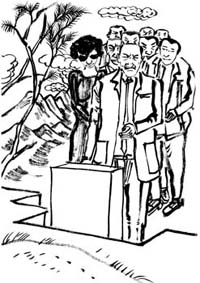 第二天,刘化一大早就带着村委会全体人员来到刘德民的家,他们要跟着去寻找考察刘喜贵的墓地。刘德民精神焕发,一路走得很急。到了村里的坟地,他左看看右找找,终于在一个不显眼的地方找到了。那是一个很小的土丘,如果刘德民不说,谁也不会想到它的底下还埋着人。细心的刘化发现,土丘虽小,可干干净净,连杂草都没有一根,看得出来是有人在悄悄地为它修整。他看了一眼刘德民,刘德民呢,眼睛望着别处。大伙看了半天,最后刘化说了:“坟是找到了,可现在这个样子不行,刘秒回来看了,绝对不会满意的。从明天开始,立即派工把坟头垒高了,再浇上水泥,坟边立上碑,也让刘秒这台湾同胞看看,咱们对他老爹老妈关照得有多好。他一高兴,没准会多给个三五十万呢!”