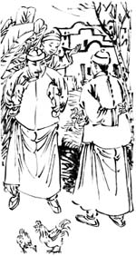 从前有三位秀才一起步行进京赶考,傍晚,他们进一农妇家借宿。