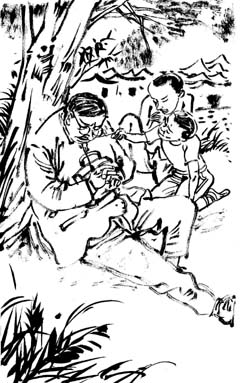他选中了一个又大又圆的黄金瓜,蹲下身刚想伸手摘,突然一只癞蛤蟆跳过来,正好跳在他选中的那只黄金瓜旁边,把他吓了一跳。癞蛤蟆胆大,看见人也不怕,两只蛤蟆眼睛骨碌骨碌对着他望,好像当他是个偷瓜贼。他正想拣块石子赶走这只讨厌的癞蛤蟆,突然背后有人猛喝:“做什么!想偷瓜吃?”