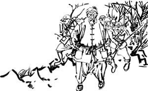 进屋之后,松本英田让罗金汉老人坐下,然后开始沏茶倒水说好话。罗金汉斜眼看着松本英田,一句话不说。松本英田一阵鬼笑:“老先生,你的,神通广大。我的请你来,是想让你通过飞禽走兽给我们打探一些八路的情报,然后你带我们进山,把八路的一网打尽;到那时,你的功劳大大的,我的重重有赏,金条、花姑娘的大大的有,你的愿意?”罗金汉微微一笑:“好啊,你们什么时候进山,我可以给你们带路。”松本英田一听,乐得差点没趴下:“越快越好,你的马上出去打探消息,然后我们就出发。”罗金汉点点头,起身往外就走。松本英田怕罗金汉耍花招,就用日语交待两个日本兵跟着,一旦发现罗金汉不对劲,就地处决。
