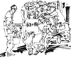 那强子在超市里左转右看,在一排货架前站住,看了看四下没有其他顾客,拿起几样东西分别揣到怀中和口袋里。早得到了“情报”盯着强子的服务员看时机已到,大喊“有贼”,只见“呼啦”一下冲出三四个保安,七手八脚将强子按倒在地痛打起来,一个保安拿出事先准备好的写着“我是小偷”的牌子挂在强子脖子上。