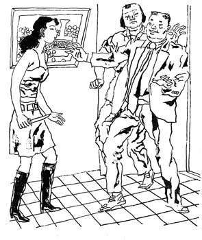 花胖子一看,袋子里的东西正是“东施媚”化妆品,他没看化妆品,淫笑着凑上去说:“什么化妆品,我就要你!”张薇吓得花容失色,大声说:“你干吗呢?你再走近一步我可要报警了!”又随手抄起桌上的水果刀,直逼着花胖子说:“你再走一步,看我不捅死你!”花胖子看这阵势,搔搔头皮,一脸不解地说:“张小姐,怎么了?电话里说得清清楚楚的,你不就是想让人包吗?告诉你,我钱多的是,你想要多少,你开个口!”
